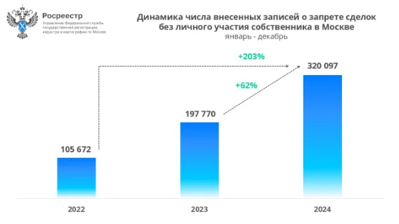 В январе-декабре 2024 года Управлением Росреестра по Москве в Единый государственный реестр недвижимости (ЕГРН) внесено 320 097 записей о невозможности совершения регистрационных действий без личного участия собственника. Об этом говорится в сообщении Росреестра