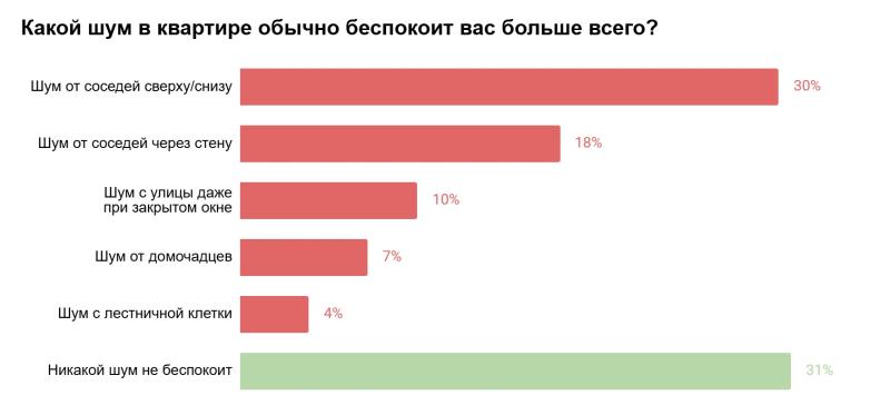 Эксперты отметили, что, как правило, проблема кроется в слабой звукоизоляции перекрытий и стен между квартирами, ведь 30% россиян чаще всего недовольны шумом от соседей сверху или снизу, а 18% – от соседей через стену. Кроме того, 10% жалуются на шум с улицы, который проникает домой даже при закрытых окнах. 7% рассказали, что сильнее всего им мешают громкие домочадцы, 4% посетовали на звуки с лестничной площадки.