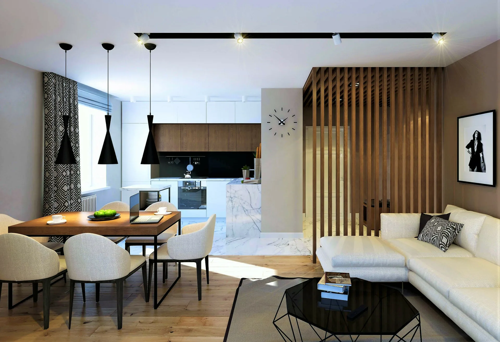 Каждый квадратный метр квартиры должен использоваться с максимальной эффективностью. Зонирование — это отличный способ разделить пространство на функциональные участки. Например, в студии можно выделить кухонную зону с помощью барной стойки, а для создания уюта в спальне стоит использовать перегородки или декоративные экраны. Не забывайте про вертикальное пространство: полки и стеллажи помогут организовать хранение и освободить место на полу.