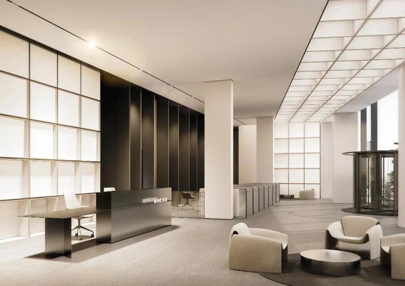 Продолжая единую архитектурную концепцию комплекса, в офисной части используются такие же, как в лобби апартаментов, приемы и отделочные материалы, но в другой композиции и ритме, соответствующей задачам лобби для офисов класса А. В отделке применяется больше металла, панелей с подсветкой, которые отвечают за единство с фасадным решением. Стойка ресепшн выполнена в общей стилистике, но уже более традиционная по конструкции. Данный функционал необходим для бюро пропусков и работы с документами. Предусмотрена мягкая группа кресел в акцентном тоне. Все элементы поддерживают строгий стиль и создают деловую атмосферу.