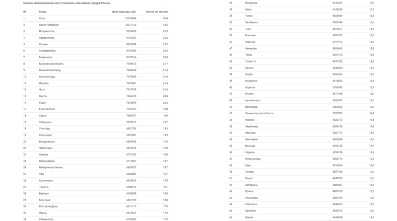 Так, полноценную однокомнатную квартиру в Москве могут позволить себе только сочинцы и петербуржцы, которые могут потянуть 36,8 и 33,5 кв. м соответственно. Жители остальных городов «везучей десятки» – Владивостока (25,9 кв. м), Севастополя (25,5 кв. м), Казани (25,3 кв. м), Симферополя (24,3 кв. м), Махачкалы (22,8 кв. м), Московской области (21,7 кв. м), Нижнего Новгорода (21,4 кв. м) и Калининграда (21,4 кв. м) – могут рассчитывать лишь на студию.