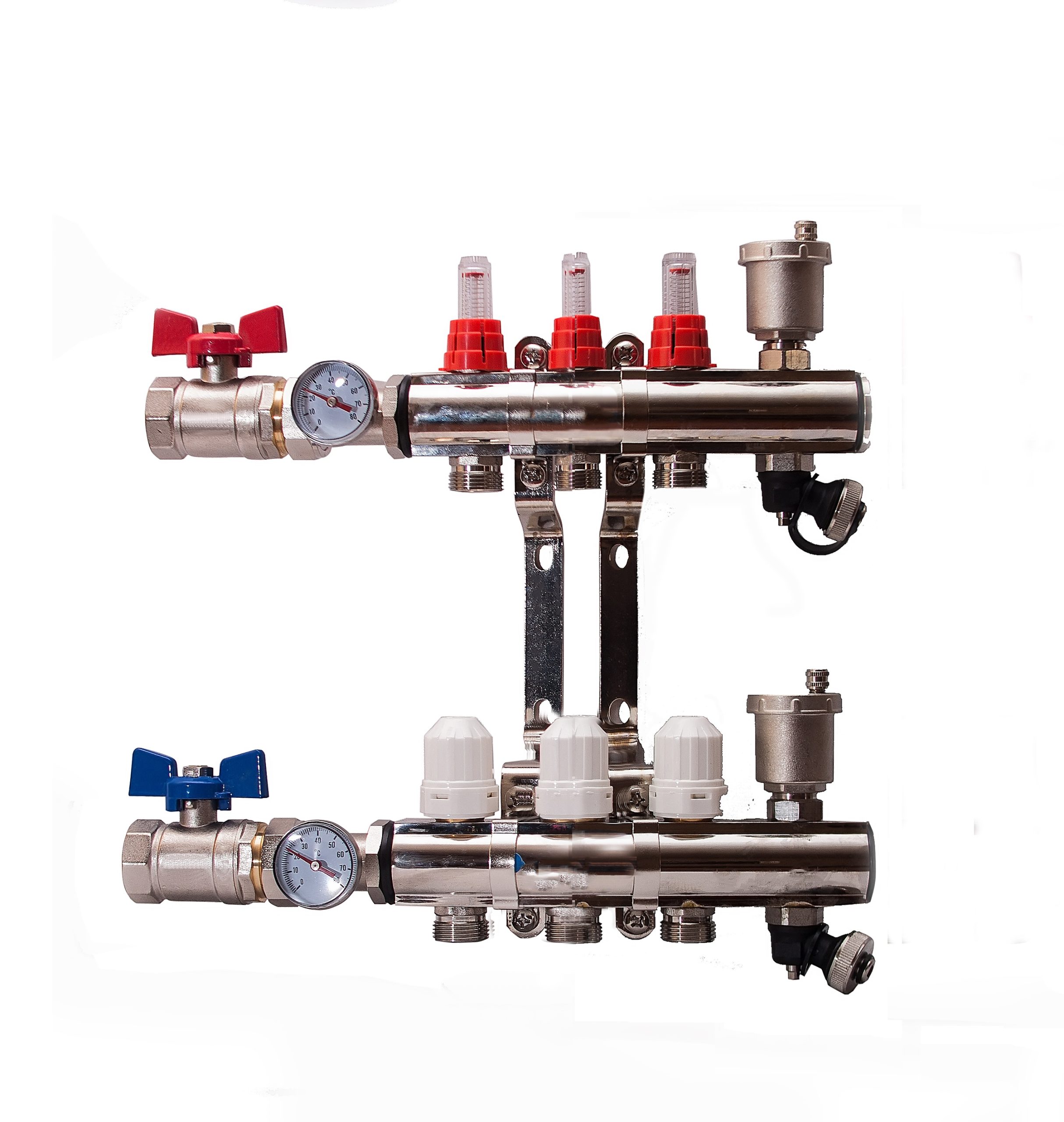 Данный тип коллектора дополнен расходомерами, которые позволяют контролировать объем теплоносителя, проходящего через каждый контур системы. Это позволяет добиться более точной настройки работы системы, исключить перегрев или недогрев отдельных зон пола. Коллекторы с регулировкой расхода особенно эффективны в крупных системах теплого пола, где требуется более тонкая настройка.