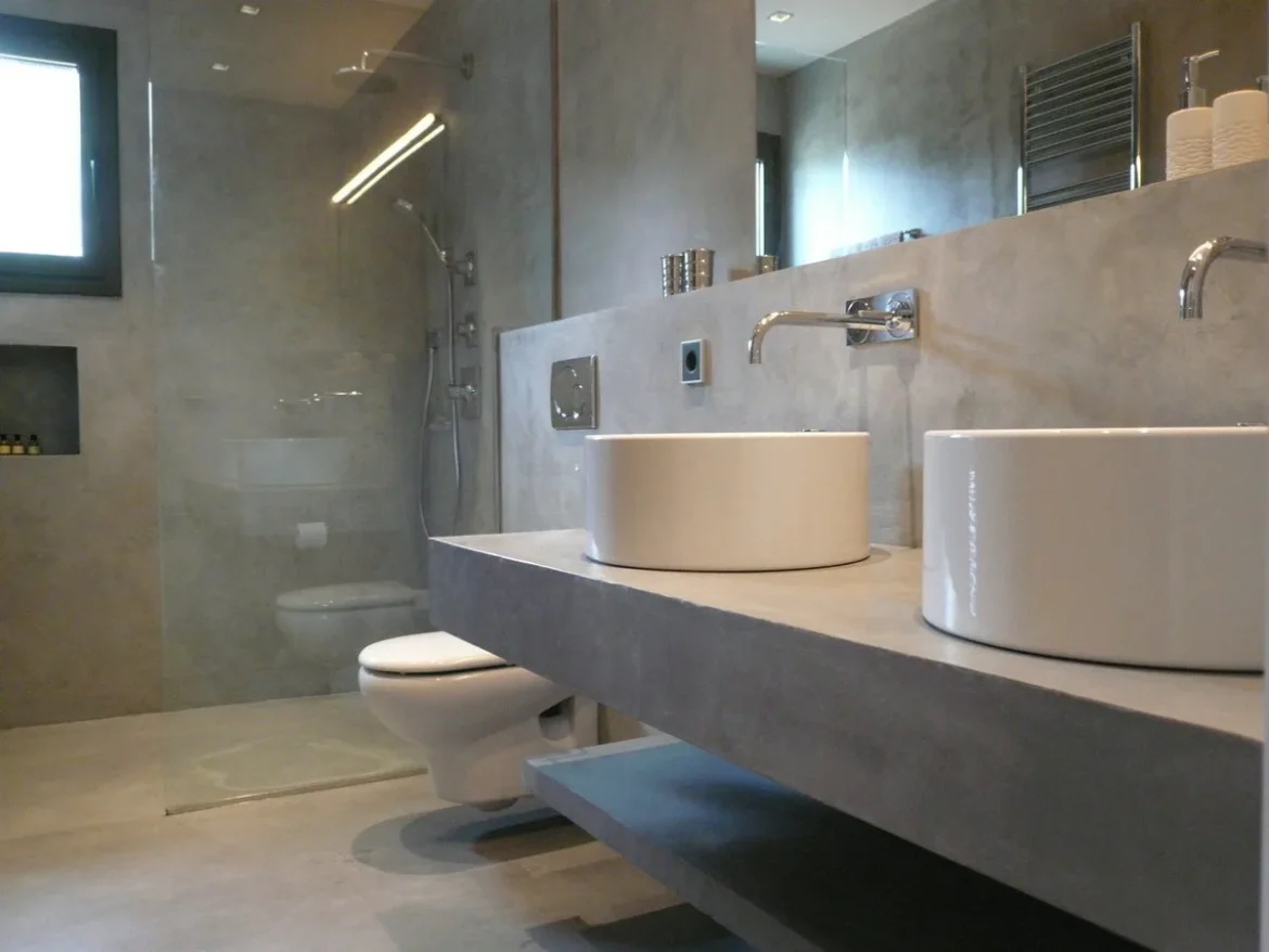 Один из главных плюсов микроцемента — это его универсальность. Хотите использовать его на полу в ванной? Легко. На кухонном фартуке? Почему бы и нет. На фасаде здания? Без проблем. Он отлично держится на: