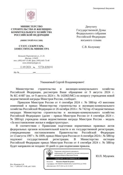 Минстрой России рассмотрел обращение Сергея Колунова от 9 августа 2024 года и своим приказом от 4 сентября 2024 года учредил новую ведомственную награду — медаль «За восстановление жилья и инфраструктуры». В Минюст России приказ будет направлен не позднее десяти рабочих дней со дня его подписания.