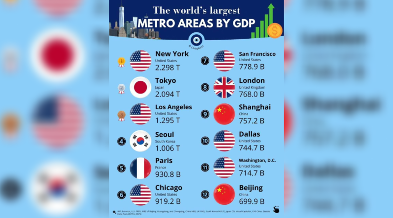На инфографике представлены 12 крупнейших городских агломераций мира по размеру валового внутреннего продукта (ВВП).