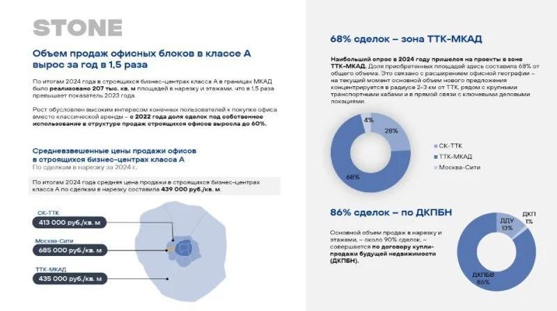 STONE По итогам 2024 года в строящихся бизнес-центрах класса А в границах МКАД в Москве реализовано более 200 тыс. кв. метров площадей: от небольших лотов до офисных этажей, что в полтора раза превышает показатель аналогичного периода 2023 года. Об этом «Стройгазете» сообщили в аналитическом центре компании STONE, добавив, что основной объем продаж – около 90% сделок – совершался по договору купли-продажи будущей недвижимости (ДКПБН).
