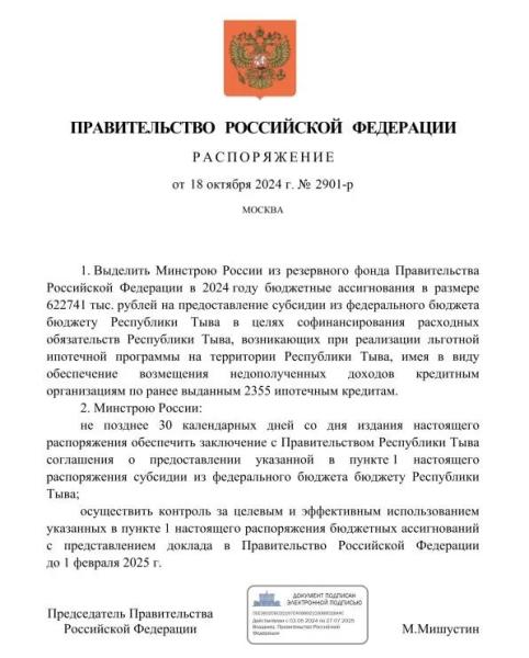 Также Минстрой России в течение 30 дней должен заключить соглашение с правительством Тувы о предоставлении субсидии.