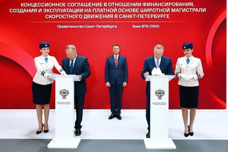 В Москве в рамках Международного форума и выставки «Транспорт России» подписано концессионное соглашение на строительство и эксплуатацию второго третьего и четвертого этапов Широтной магистрали скоростного движения (ШМСД). Об этом «Стройгазете» сообщили в пресс-службе правительства Санкт-Петербурга, уточнив, что документ подписали губернатор города Александр Беглов и президент-председатель Правления ВТБ Андрей Костин в присутствии министра транспорта РФ Романа Старовойта.