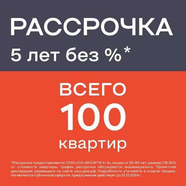 Оформляйте беспроцентную рассрочку на 5 лет без удорожания стоимости и покупайте новую квартиру в районе, где всё учтено! Эксклюзивное предложение от ИНСИТИ действует на 100 квартир в Образцово (Литер 5) до 31.12.2024 г.