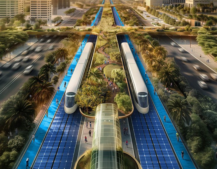 Инфраструктура на 100% будет функционировать за счет возобновляемых источников энергии. На трамвайные пути установят панели с солнечными батареями, вырабатывающие более 300 мегаватт энергии. Это позволит значительно сократить выбросы углекислого газа — до 1 млн тонн в год. Кроме того, планируется создать здесь специальную дренажную систему, помогающую перерабатывать дождевую воду. Вокруг высадят миллион деревьев и создадут фермы. Горожане смогут обустроить здесь огорода и клумбы.