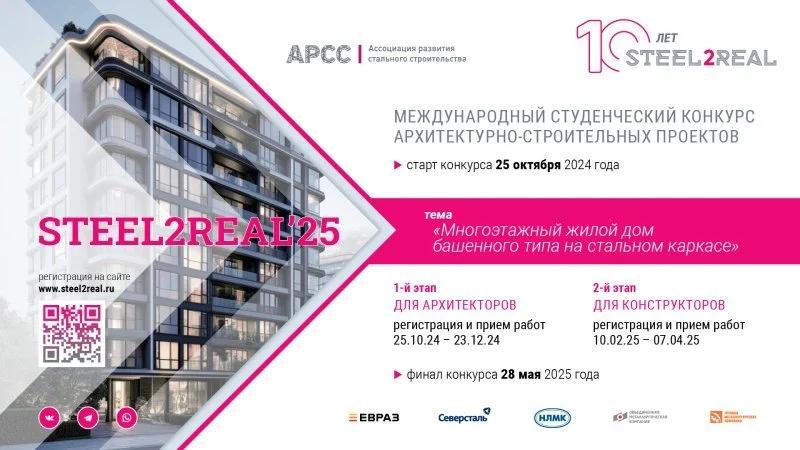 25 октября 2024 года в 15:00 (МСК) в формате онлайн стартует юбилейный 10-й Международный студенческий конкурс архитектурно-строительных проектов Steel2Real, организованный Ассоциацией развития стального строительства (АРСС). Об этом «Стройгазете» рассказали представители конкурса.