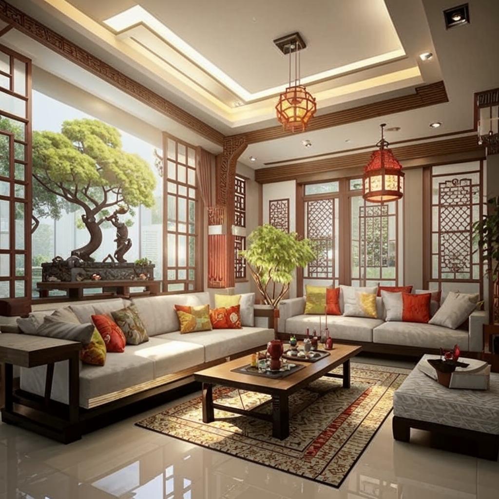 Мебель: используются низкие диваны и столики, а также мебель с резьбой и узорами.
