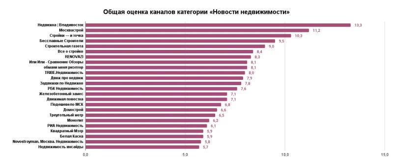 Для более корректного оценивания каналов аналитики разделили их на семь категорий: новости недвижимости, госструктуры, лица недвижимости, первичный рынок, архитектура и урбанистика, аналитика, B2B-сообщества.