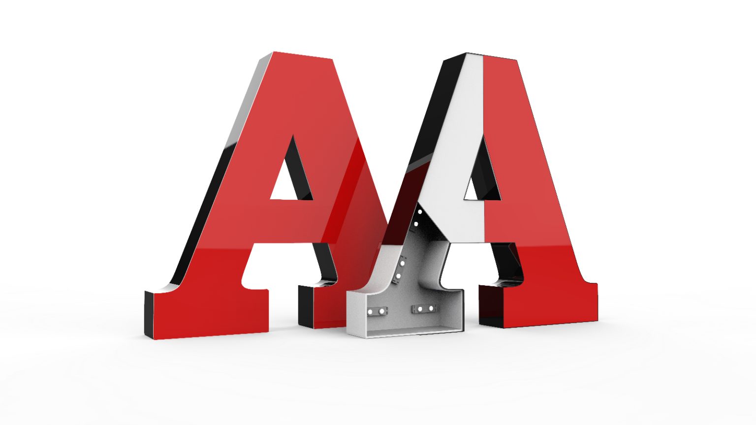 - Лицевая подсветка. Свет идёт через переднюю часть буквы — ярко, заметно, читаемо.