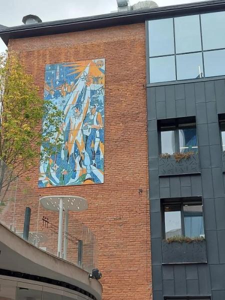Фото: Юлия Пилипейко В деловом квартале «Товарищество Рябовской Мануфактуры», расположенного в рядом со станцией метро «Тульская» в Москве, завершилась реставрация и установка советского стеклянного панно «Достижения СССР».