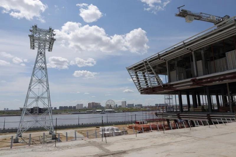 Журналисты посетили строящееся здание терминала канатной дороги, где увидели установленные в апреле шкифы весом 9 тонн. «Шкиф — сердце оборудования канатной дороги. Для установки шкифов потребовалась ювелирная работа специалистов, которые смогли через небольшое отверстие в крыше опустить их краном, не задев уже смонтированные несущие конструкции, и с филигранной точностью поставить их на свои места», — рассказала Екатерина Кузьмина.