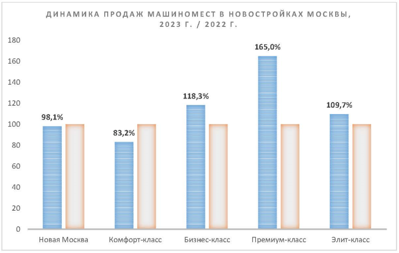 В бизнес-сегменте спрос на места в паркингах вырос на 18,3%, но за тот же период продажи квартир и апартаментов совершили 77,8% скачок. Соответственно, диспропорция в структуре сделок между различными типами недвижимости только усилилась: было – менее 3 к 1, стало – 4 к 1. Темпы удорожания машиномест в новостройках бизнес-класса оказались в разы ниже, чем в масс-маркете. Подъем ограничился 5,8% (с 2,93 до 3,10 млн рублей). К слову, примерно на столько же изменилась средняя цена и в премиум-классе (плюс 6,2%, с 3,22 до 3,42 млн рублей). Примечательно, что на рынке премиальной недвижимости наблюдается прежнее соотношение: одно парковочное место на каждые два жилых лота. Поскольку большинство машиномест в элитных комплексах реализуются через закрытые сделки, корректно определить средний прайс не представляется возможным. Тем не менее, даже отрывочные данные позволяют судить о порядке цен. Известно, что компания Sminex продала в своих новостройках 12 машиномест стоимостью 15+ млн рублей. Осенью 2023 года была зарегистрирована сделка с участием парковочного лота из фонда ЖК «Лаврушинский», который при габаритах 22,3 кв. м стоил 20,37 млн рублей. Это дороже 79,5% квартир и апартаментов, реализованных в Москве за 2023 г.