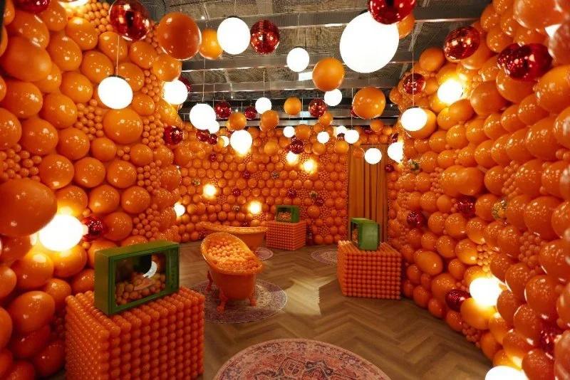 Ностальгию передали через поставленные друг на друга ящики с воспоминаниями. Спокойствие воплотили через эффект каустики, который создается светом, направленным на отражающую поверхность металла, смятение – через обволакивающую композицию из войлока. Вдохновение –через аллюзию на сложный и тернистый поиск творческого начала, которое мерцает где-то вдали, уют – через детский замок из подушек и одеял. Удивление нашло вдохновение в северном сиянии и оживающих на стенах рисунках. Тревогу передали через холодное урбанистическое пространство с четкими линиями и вертикальными трубами, которые создают эффект сжатия. Стабильность – через устойчивость табурета, озарение – через пещеру со световым центром, притягивающим к себе. А последнее пространство становится кульминацией эмоционального лабиринта, отсылает посетителей к Новому году и дарит ощущения уютного домашнего праздника.