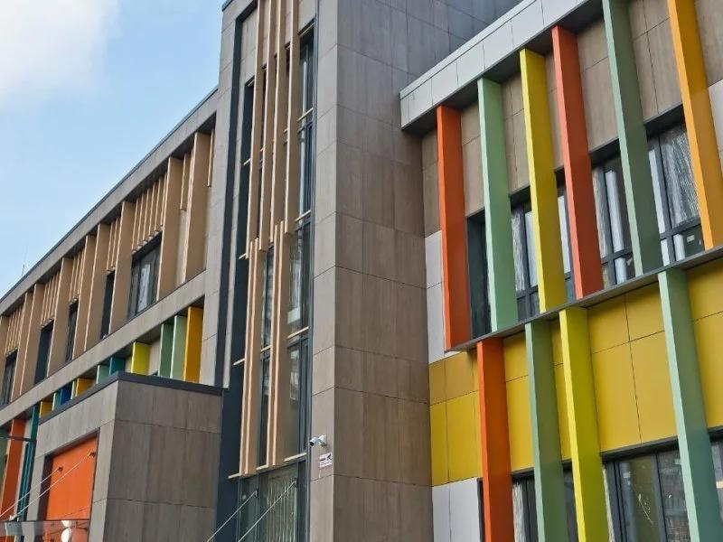 Здание имеет переменную этажность – от двух до трех этажей. При оформлении фасадов использовали керамогранит и декоративные рейки из алюминия. Кровлю здания сделали цветной, что позволило гармонично вписать объект в жилую застройку.