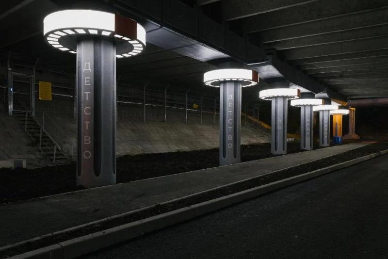 Третья идея — кардинальная трансформация среды под мостом. Создание места памяти совместили с переустройством дороги и пешеходных маршрутов, по обочинам которых разбили газон. За счет появления 12 светильников пространство, несколько месяцев назад представлявшее собой болото, стало безопасным и удобным для прогулок.