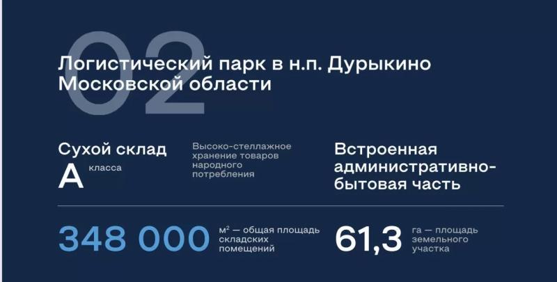 Второй проект находится в Московской области, н.п. Дурыкино. Разрешение на строительство первой очереди нескольких складских помещений получено в мае 2024 года. Месторасположение логистического хаба выбрано с учетом максимальной транспортной доступности: рядом проходит Ленинградское шоссе и есть удобный заезд с ЦКАД.