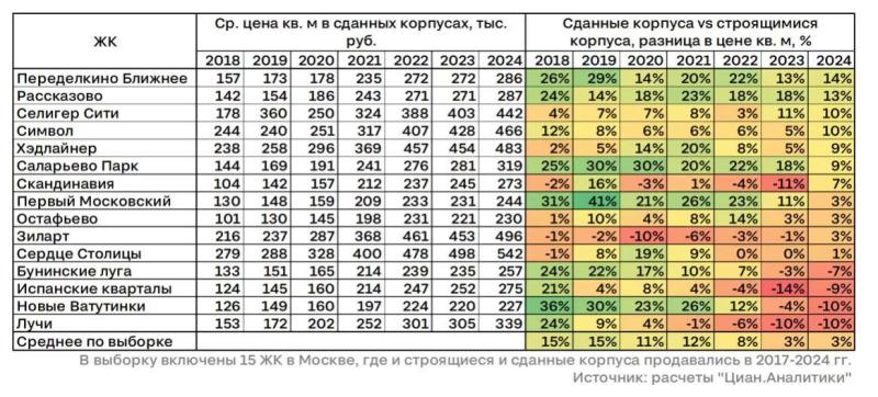 В 15 ЖК в Москве, где строящиеся и сданные корпуса были на протяжении последних 7 лет, вторичка по-прежнему чуть дороже первички. При этом тренд на сокращение разницы заметен — в 2018 году средний спред по выборке составлял 15%.