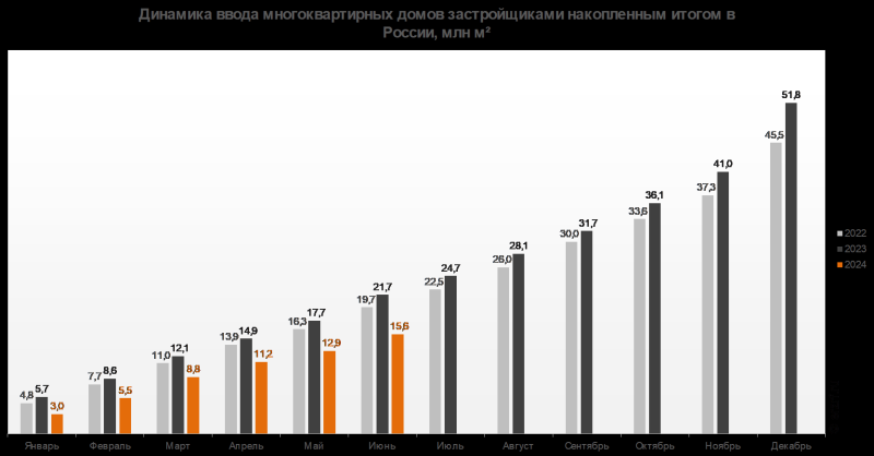 В июне 2024 года в России застройщиками введено 2,6 млн м² многоквартирных домов, что на 35,0%, или на 1,4 млн м² меньше аналогичного значения за тот же период 2023 года.