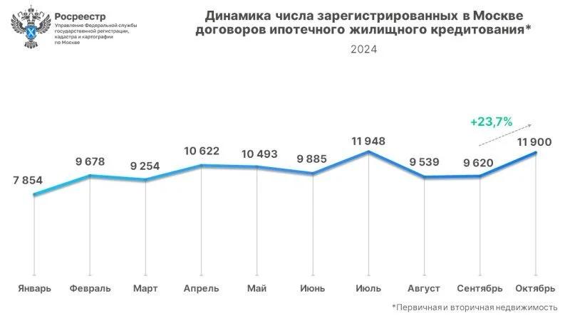 В октябре 2024 года управлением Росреестра по Москве зарегистрировано 11 900 договоров ипотечного жилищного кредитования на первичном и вторичном рынках недвижимости, что превышает результат сентября текущего года (9 620) на 23,7%, сообщила пресс-служба ведомства.